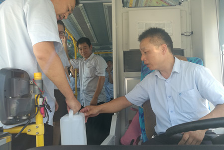 為鞏固培訓成效,公交公司還組織開展了公交車防恐突發(fā)事件實戰(zhàn)演練。在演練車上,一名攜帶不明液體的乘客上車,公交駕駛員根據(jù)相關規(guī)定對乘客攜帶物品進行詢問和檢查,確認安全,放行旅客上車。同時,演練人員在車廂內(nèi)演示了安全錘及滅火器的使用方法。