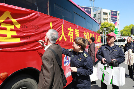 活動期間,公交志愿者們身穿紅馬甲、頭戴小紅帽,團結協(xié)作,分工配合,現(xiàn)場秩序一片井然。有的在火車站廣場上發(fā)放掃黑除惡專項斗爭宣傳資料和印有活動主題的環(huán)保袋,有的走進公交車廂開展義務宣傳,還有的負責引導市民在橫幅上簽名,表達自己對活動的支持。宣傳過程中,志愿者們耐心地向市民宣傳掃黑除惡專項斗爭、平安創(chuàng)建工作、國家安全、治安安全等相關知識,希望通過此次宣傳鼓勵公眾積極參與舉報,共同維護社會治安穩(wěn)定。整個宣傳活動持續(xù)了兩個多小時,市民參與度很高,既有年輕的學生族、上班族,也有許多外來乘客和老年乘客,他們紛紛在橫幅上簽下了自己的名字,并表示將以實際行動參與到國家安全教育宣傳和掃黑除惡專項斗爭中來。