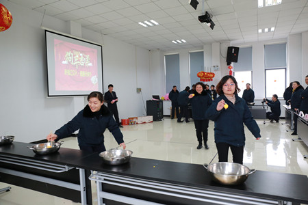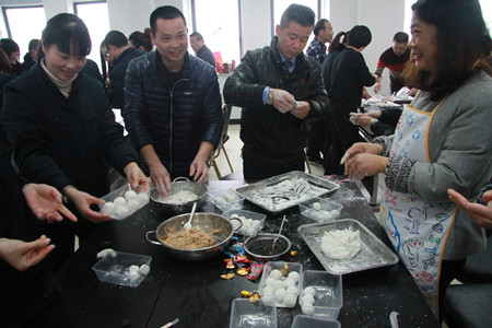元宵”慶典活動以“聲聲報福”的踩氣球游戲開場,將現場氣氛推向了第一個小高潮,游戲以一對一踩對方腳邊綁上的氣球形式開展。參賽者各個身懷絕技,互不相讓,圍觀者們也時不時爆發出陣陣歡快的笑聲。隨后是“團團圓圓”“幸福滾滾”等幾輪小游戲。到了傳統節目“猜燈謎”環節,大家的積極性愈發高漲,主持人話筒還來不及遞到跟前,大家就已紛紛搶答,氣氛十分熱鬧。所有小游戲結束后,是主題包元宵活動。大家齊心協力、分工明確,揉面的揉面,拌餡的拌餡,“要裹緊一點,不然一會兒一煮就散了。”前輩們時不時地向“新手”們傳授著經驗,不一會兒,一個個白白圓圓的湯圓就擺滿了桌面,現場一派熱鬧歡騰的景象。