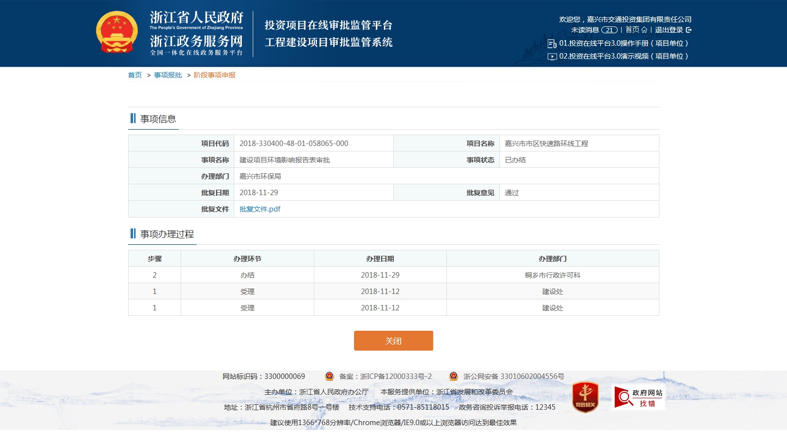 嘉興市市區(qū)快速路環(huán)線工程一期建設(shè)項目環(huán)境影響報告表審批